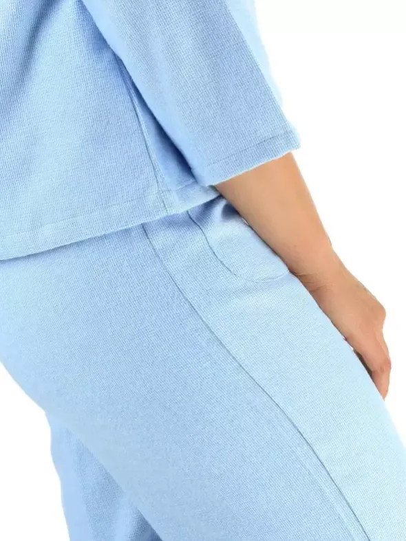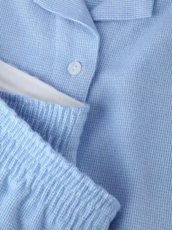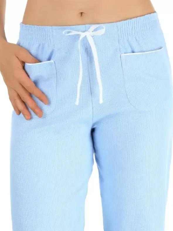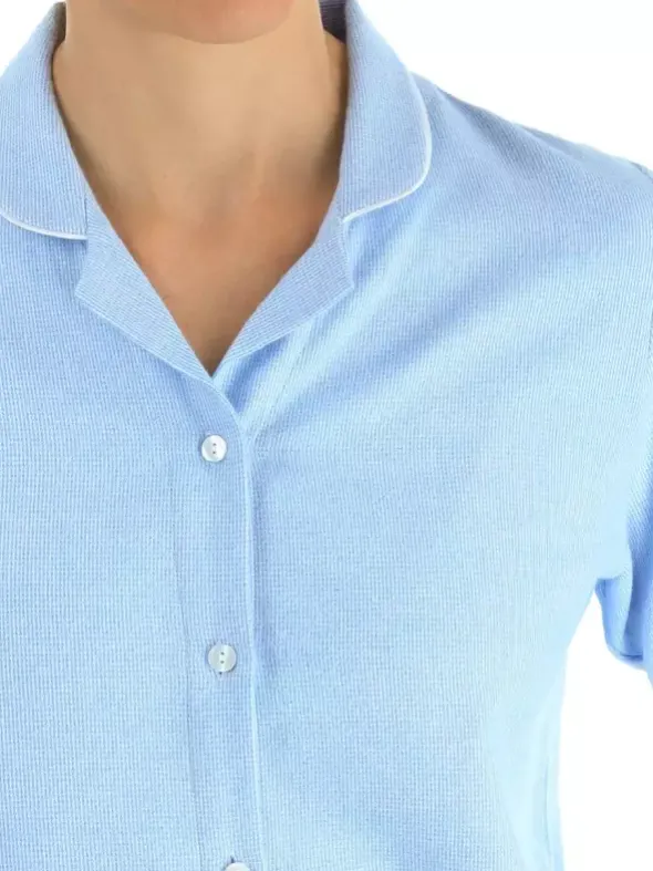In kuschelig weichem Vollzwirn-Flanell präsentiert NOVILA den beliebten 7/8 – Pyjama Pia, erhältlich in fein kariertem Hellblau oder Flamingo. Der dicht gewebte und flauschig geraute Stoff begleitet Sie zuverlässig durch kältere Nächte. Der patentierte NOVILA Softbund mit Tunnelzug und die aufgesetzten Taschen der geraden Hose sorgen für praktischen Komfort. Das durchgeknöpfte Oberteil mit rundem Reverskragen und Paspelierung kreiert einen stilvollen Auftritt. Gehen Sie keine Kompromisse ein, wenn es um Ihr Wohlbefinden geht und entscheiden Sie sich mit diesem Zweiteiler für eine exquisite Verarbeitung, ausgewählte Rohstoffe und höchsten Tragekomfort.