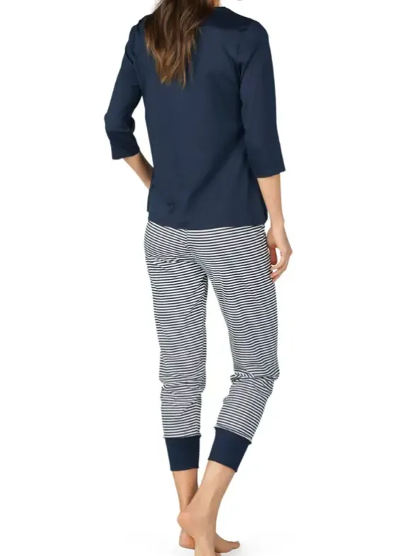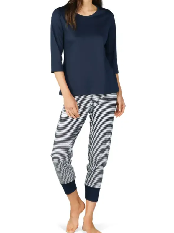 Mey Night Basics – die edle Nachtwäsche Serie Paula – hier ein bequemer und hochwertiger Pyjama in 7/8 Schnittform. Der Pyjama besteht aus einer 7/8 Pyjamahose mit breiten Bündchen an den Beinabschlüssen in modernem Querringel Chic. Dazu optimal kombiniert wird ein unifarbenes Shirt mit Rundhalsausschnitt und 3/4 langen Armen. Das weiche Interlock Gewebe aus reiner Baumwolle werden Sie nicht mehr missen wollen. Mit seiner legeren Passform und dem hohen Tragekomfort wird dies Ihr nächster Lieblingsschlafanzug.