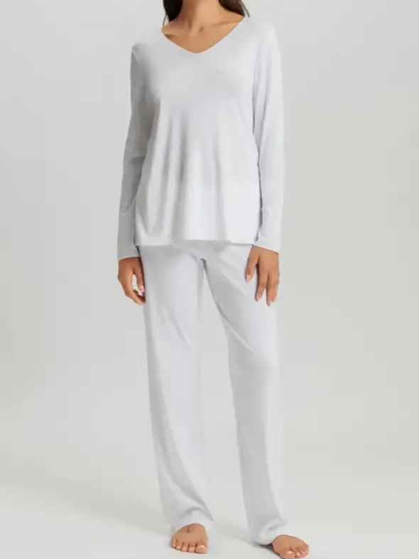 Der Cotton Silk Pyjama von HANRO ist der Inbegriff von luxuriöser Nachtwäsche, der die natürliche Schönheit von 100 % merzerisiertem Baumwollinterlock mit der raffinierten Eleganz von Seidendetails kombiniert. Dieses Pyjama-Set, bestehend aus einer langen Hose und einem Langarmshirt, ist perfekt für jene, die auch bei ihrer Loungewear auf stilvolles Design und außergewöhnlichen Komfort Wert legen. Die feinen Seidenakzente am V-Ausschnitt, an den Ärmeln und am Shirtsaum verleihen diesem Set einen Hauch von Luxus und machen es zu einem idealen Begleiter sowohl für ruhige Nächte zu Hause als auch für stilvolle Momente am Strand. Hergestellt in Österreich, verspricht dieses Pyjama-Set eine verbesserte Strapazierfähigkeit, brillante Farben und einen erhöhten Glanz, die es zu einem Must-have für jede anspruchsvolle Garderobe machen.