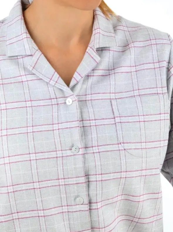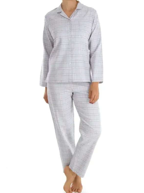 Einfach nur Wohlfühlen. Das verspricht der Flanell Pyjama Helena in zurückhaltender Optik in hellem grau und zartem violett. Das flauschige und voluminöse Vollzwirn-Gewebe wurde aus reiner Baumwolle erschaffen und sorgt für einen wärmend weichen und hautfreundlichen Tragekomfort. Die legere, aber nicht zu weite Passform sorgt für einen gepflegten Look. Zur Reversjacke mit Seitenschlitzen und Brusttasche wird eine schmal zulaufende Hose mit dem bewährten NOVILA Softbund kombiniert.