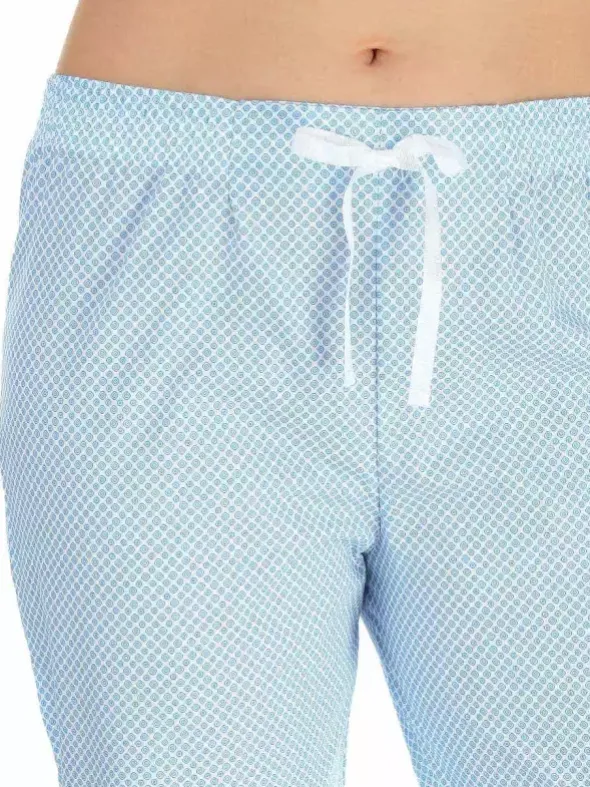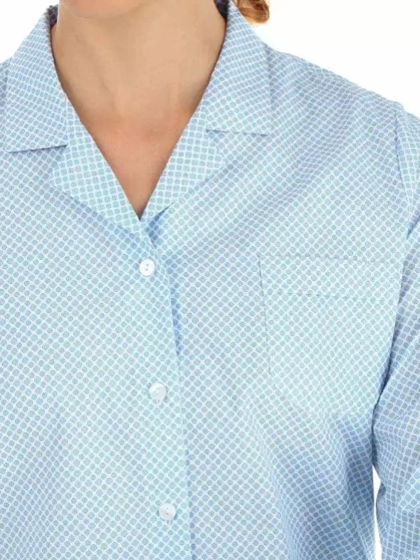 Der klassische Pyjama Helena hier in einer hochwertigen Popeline-Ausführung aus 100% Baumwolle. Diese besticht durch das dichtmaschige und besonders glatte und geschmeidige Flachgewebe, welches für einen hautsympathischen Tragekomfort sorgt. Der patentierte NOVILA Softbund mit innen angebrachtem Wäschegummi, welcher außen als Paspel sichtbar ist, das Bindeband zur Weitenregulierung und die Seitennahttaschen sorgen für praktische Gemütlichkeit. Das detaillierte Muster in Hellblau rundet das Bild wundervoll ab. Gönnen Sie sich diesen exquisiten Pyjama für elegante, erholsame Stunden.