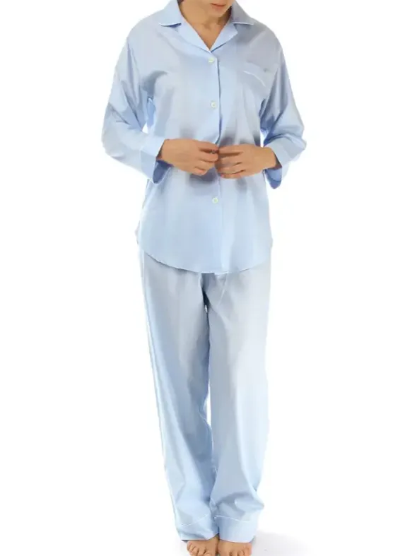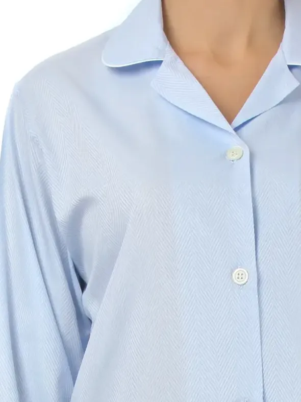 Dieser wunderbar leichte und zugleich blickdichte Pyjama mit gewebten Fischgratmuster begeistert Damen mit Stil. Das zarte Baumwollgewebe legt sich sanft auf Ihre Haut. Der zarte Glanz betont den edlen Fischgrat und wird Sie begeistern. Abgerundet wird die klassische Ausführung mit breiten Arm- und Beinabschlüssen und einer aufwendigen Paspelierung in weiß. Die Pyjamahose wurde mit einem elastischen Bund ausgestattet. Die angenehm weite Schnittform ermöglicht Ihnen uneingeschränkte Bewegungsfreiheit.