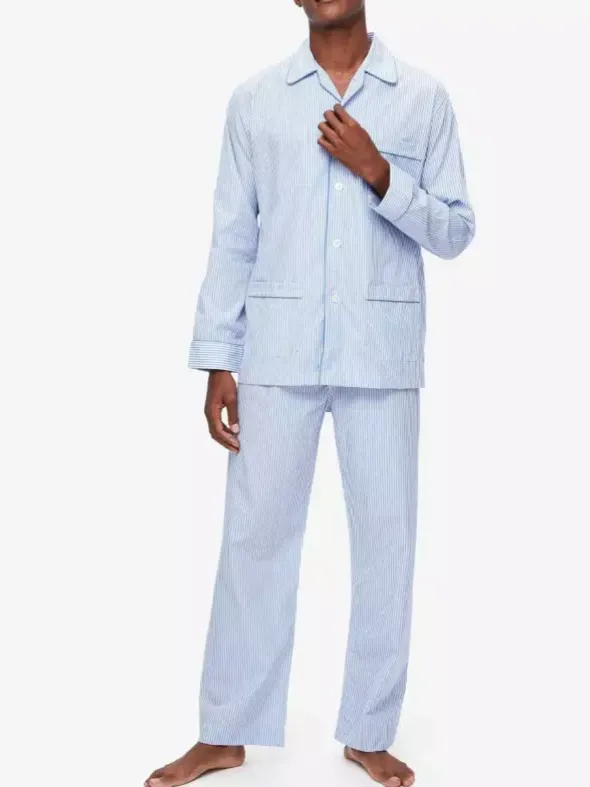 Der klassische Zweiteiler James aus leichter und atmungsaktiver Baumwolle. Dieser Pyjama wurde entwickelt, um Ihnen das ganze Jahr über höchsten Komfort und Enspannung zu bieten. Der elegante Reversschnitt und der bequeme, verstellbare Bund mit 2 Knöpfen und elastischen Seitenteilen lässt keine Wünsche offen. Das blau-weiß gestreifte Design bringt frischen Wind in Ihren Kleiderschrank und macht immer eine gute Figur.