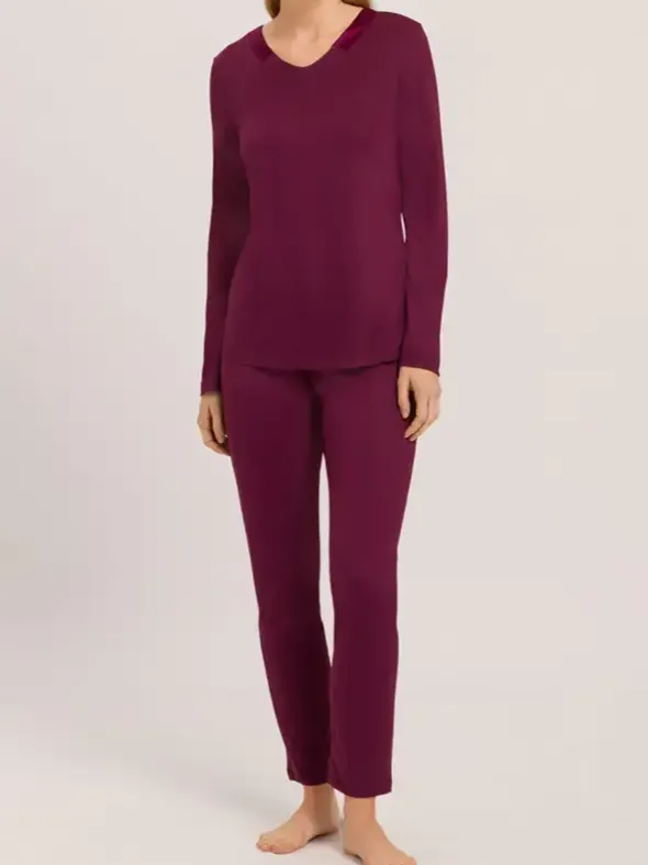 Ein eleganter und zugleich puristischer Nachtwäschelook erwartet Sie mit dem hochwertigen Pyjama Joela aus der neuen Kollektion von HANRO. Durch die legere Passform, den Elastikbund an der gerade geschnittenen Hose und den weich fallenden Interlock aus Baumwolle und Modal entsteht ein besonders angenehmes Tragegefühl. Für eine edle Optik sorgen die sanft schimmernden, elastischen Seidenelemente am Halsausschnitt.