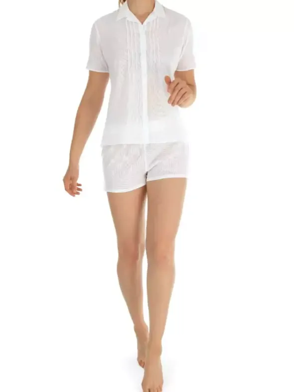 Wunderbar leichter Kurzpyjama aus leichtem und atmungsaktiven Batist. Gefertigt aus reiner Baumwolle sorgt dieser für ein angenehmes Hautgefühl. Der Schnitt mit durchgeknöpftem Oberteil, zarten Biesennähten und eckigem Reverskragen verspricht einen stilvollen Auftritt. Die kurze Hose ist zudem mit einem druckfreien Softbund samt dekorativen Bindeband gearbeitet. Feine Streifen im Webbild ergänzen sich zusammen mit der dezenten Transparenz des Stoffes zu einer wunderbar femininen Optik.