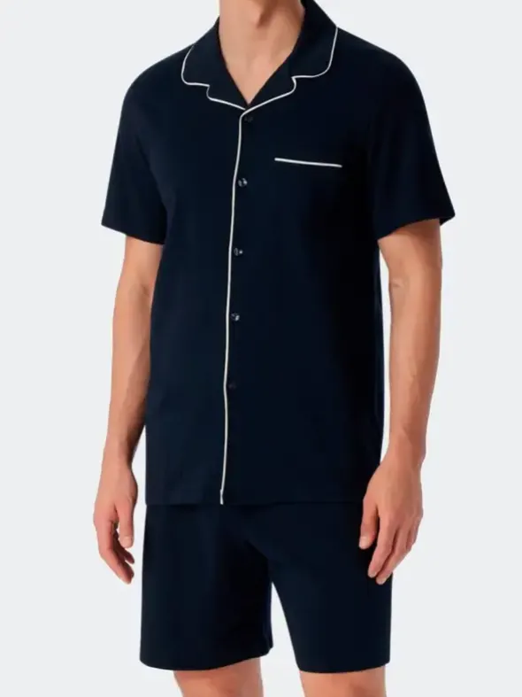 Dieser kurze, dunkelblaue Herren-Pyjama erfüllt alle Wünsche! Mit seiner schlanken Schnittform, weißen Paspeln und der Brusttasche strahlt er pure Eleganz aus. Weicher Interlock aus 100% Baumwolle verspricht hohen Tragekomfort. So steht entspannten Nächten in bester SCHIESSER-Qualität nichts mehr im Wege!