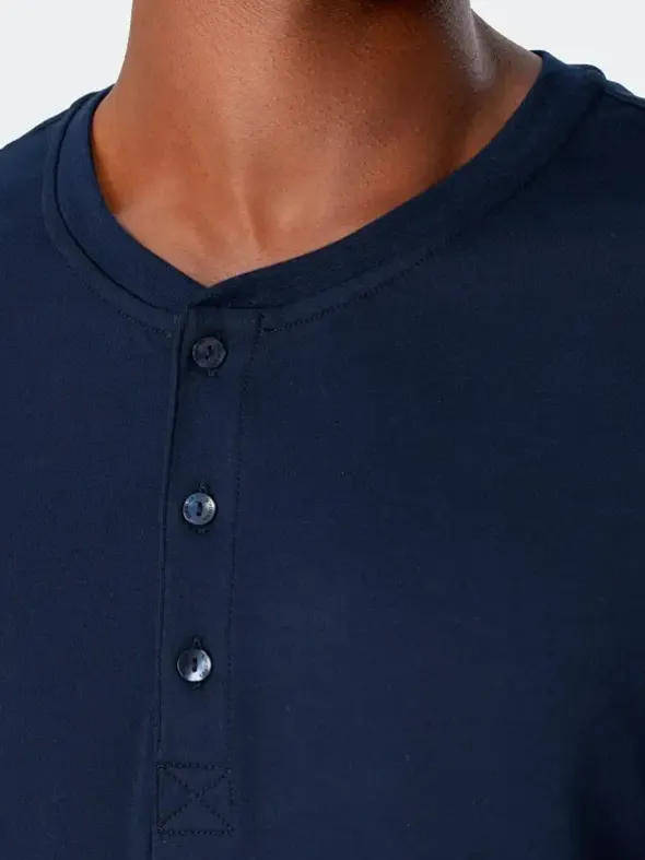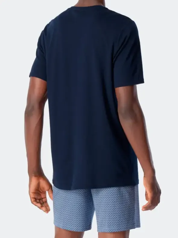 Dieser kurze Herren-Schlafanzug überzeugt mit seinem maskulinen und zugleich modischen Look. Das dunkelblaue T-Shirt mit Serafino-Kragen und Knopfleiste wird durch die Shorts mit lockerer Passform und praktischem Bindeband perfekt ergänzt. Ein echter Hingucker ist dabei das grafische Minimalmuster. Fehlen nur noch der weiche Interlock-Stoff aus 100 % Baumwolle sowie beste SCHIESSER-Qualität!