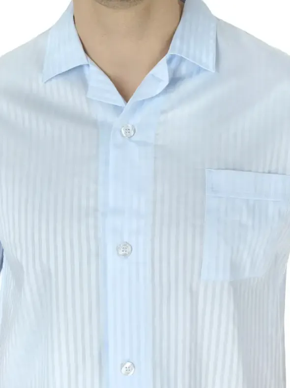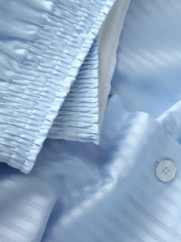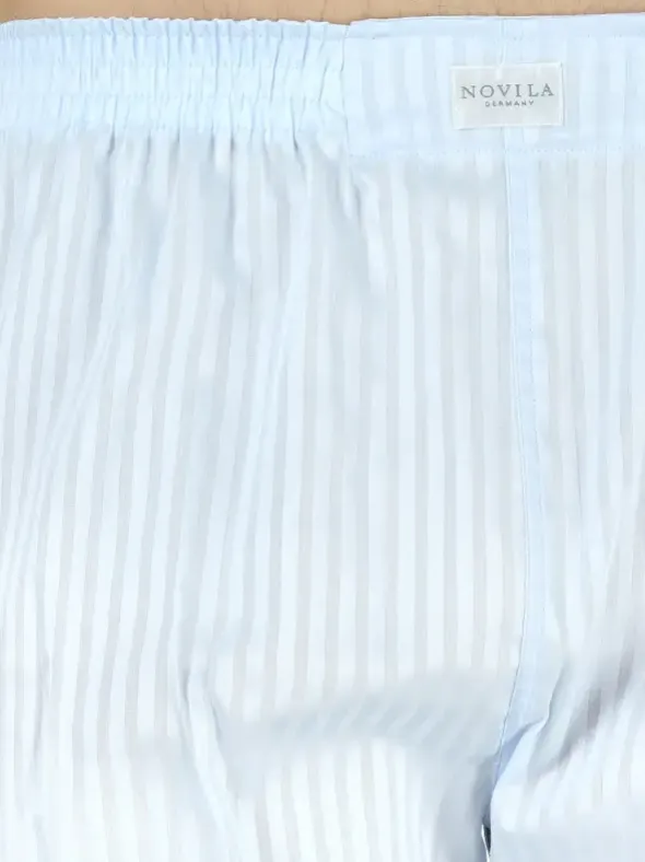 Der luxuriöse Kurzpyjama Marco aus Voile-Satin besticht mit seiner eleganten Optik und dem edlen Material. Die leicht transparenten Voile-Streifen wechseln sich hier mit sanft glänzenden Satin-Streifen ab. Das durchgeknöpfte Oberteil ist mit einer Brusttasche, einem Reverskragen, zwei Seitentaschen und Perlmuttknöpfen versehen. Die Pyjamahose ist mit enem Eingriff und dem NOVILA Softbund ausgestattet. Die reine Baumwolle garantiert einen unkomplizierten und pflegeleichten Tragekomfort.