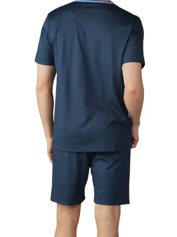 Die Mey Night Basic Serie besticht unteranderem mit diesem kurzen Zweiteiler aus reiner, atmungsaktiven Baumwolle in Jersey – Qualität. Ein legerer Schnitt und lockerer Sitz ermöglicht hohe Bewegungsfreiheit und erholsame Nächte. Ein dominantes dunkelblau mit dezentem Glanz sorgt für einen maskulinen Look. Das kurzarm Shirt mit paspeliertem V – Ausschnitt und Brusttasche, bildet mit kurzen Shorts mit bequemen Bund ein perfektes Ganzes.