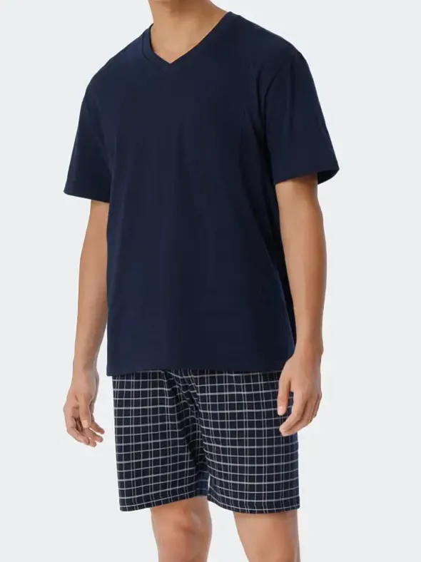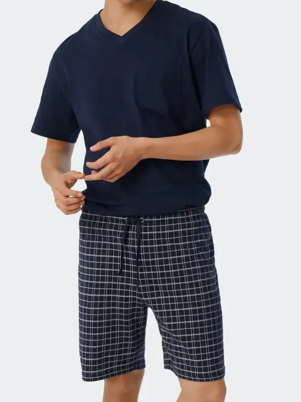 Reine Baumwolle in einer weichen Single Jersey Qualität vereint einen natürlichen Tragekomfort mit unkomplizierten Pflegeeigenschaften und ist so die perfekte Wahl für diesen legeren Kurzpyjama aus der Schiesser Kollektion Day and Night. Das Kurzarm Shirt mit V-Ausschnitt und Brusttasche sowie flachen Abschlüssen in unifarbenem anthrazit, sorgt für ein lockeres Erscheinungsbild. Eine bequem sitzende kurze Hose mit modischem Karomuster in anthrazit mit Bindeband, Gesäßtasche und weiten Beinabschlüssen macht diesen Zweiterler perfekt.