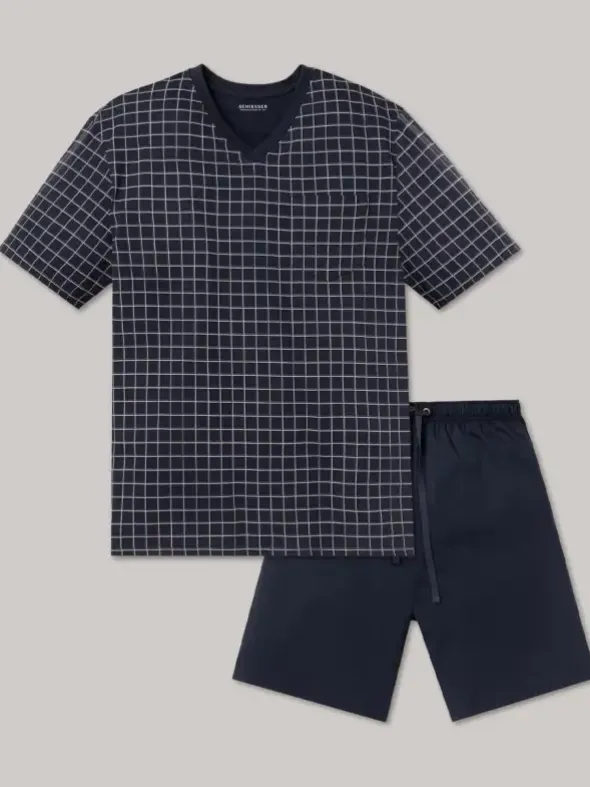 Reine Baumwolle in einer weichen Single Jersey Qualität vereint einen natürlichen Tragekomfort mit unkomplizierten Pflegeeigenschaften und ist so die perfekte Wahl für diesen sportiven Kurzpyjama aus der Schiesser Kollektion Day and Night. Das Kurzarm Shirt mit V – Ausschnitt in maskuliner Karo Optik aus weiß und grau vereint auf dunkelblauen Grund sorgt für ein lockeres Erscheinungsbild. Eine leger sitzende kurze Hose mit Kordelzug macht diesen Zweiterler perfekt.