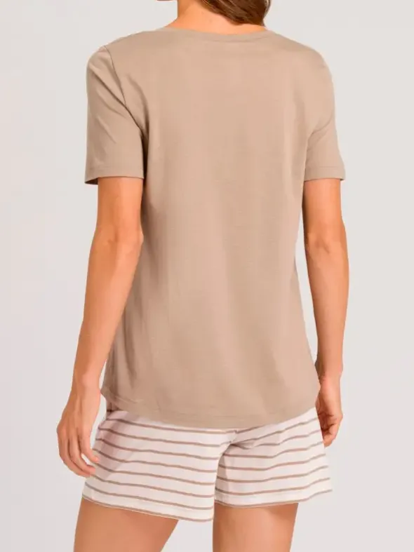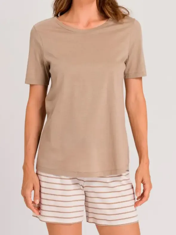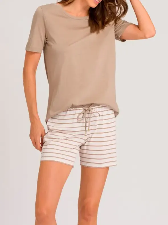 Ein sommerlich frischer Look aus der Serie Laura erwartet Sie mit der neuen Frühjahr/Sommer-Kollektion von HANRO. Der legere Kurzpyjama mit unifarbenem Rundhalsshirt und gestreifter Shorts ist der perfekte Wohlfühllook – sowohl bei Tag als auch bei Nacht. Ein super weicher Single-Jersey aus Modal und Baumwolle verspricht einen angenehmen Tragekomfort und macht diese modische Kombi schnell zum Lieblingslook im Kleiderschrank.