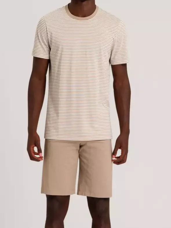 Lässiger Kurzpyjama von HANRO in angenehmer Single-Jersey-Qualität. Der Stoff aus reiner Baumwolle ist weich und flexibel und verspricht ein angenehmes Tragegefühl. Die Kombination aus unifarbener Shorts und dezent gestreiftem Rundhalsshirt wirkt sportlich und modern und ist auch untereinander mit weiteren Styles der aktuellen Kollektion kombinierbar.