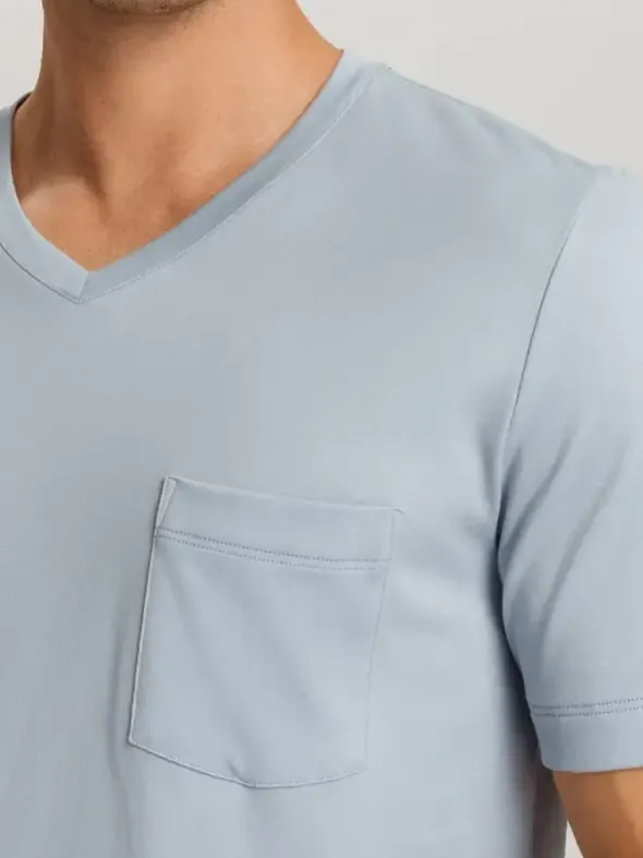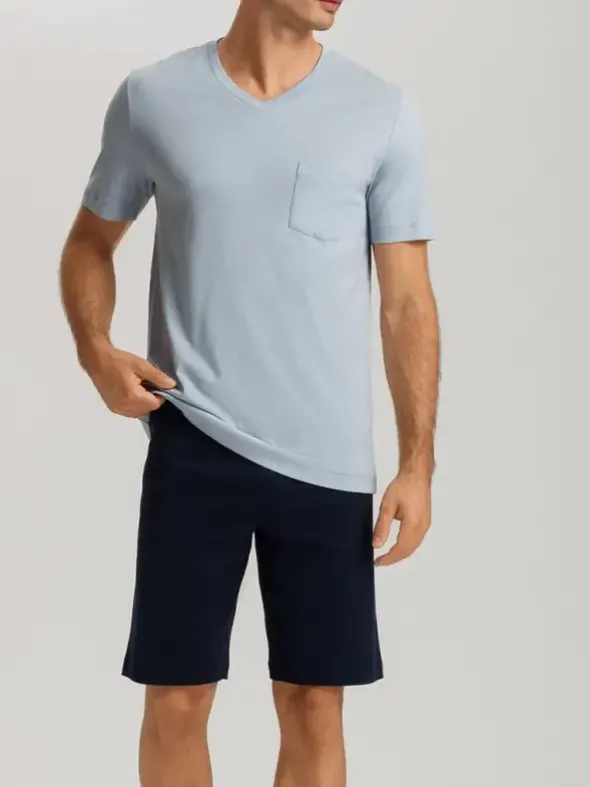 Der Herren Pyjama – Night & Day von HANRO kombiniert klassischen Komfort mit einem modernen Color-Blocking-Look. Das Oberteil besteht aus einem Kurzarmshirt mit V-Ausschnitt und lässigen Kontrastelementen, das einen sportlichen Touch verleiht. Die kurze Hose sorgt für zusätzlichen Komfort und lässt sich perfekt mit dem Oberteil kombinieren. Der verdeckte Gummibund sorgt für eine bequeme Passform, während das weiche Material aus 100% Baumwolle den Pyjama angenehm auf der Haut trägt. Ein idealer Begleiter für entspannte Nächte und stylische Stunden zu Hause.
