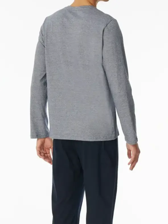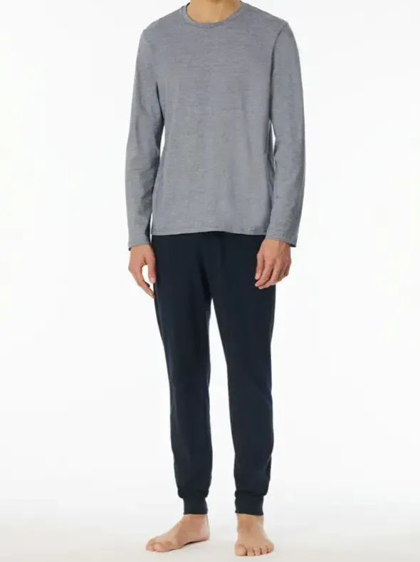 Dieser lange Herrenschlafanzug aus der SCHIESSER Serie „Casual Essentials“ überzeugt durch sein stilvolles Design und hohen Tragekomfort. Das Oberteil mit feinen, gestrickten Ringeln in Nachtblau und Weiß verleiht dem Schlafanzug einen modernen Look. Die unifarbene Hose in Nachtblau, ausgestattet mit bequemen Bündchen an den Beinabschlüssen, sorgt für eine perfekte Passform. Hergestellt aus weicher Single-Jersey-Qualität, bietet der Schlafanzug viel Bewegungsfreiheit und ein angenehmes Tragegefühl. Perfekt für alle, die auf schlichte Eleganz und Komfort setzen.