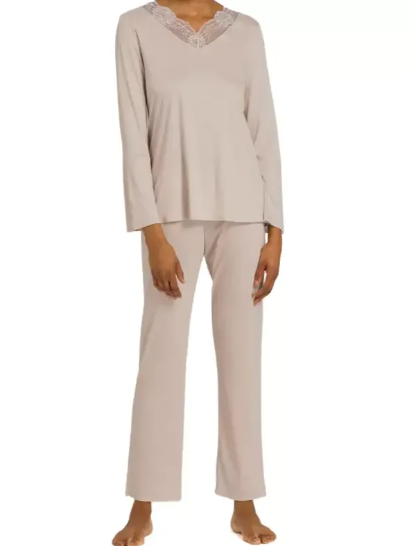 Die neue Wäscheserie Lovis aus der aktuellen Herbst Winter Kollektion von HANRO hält diese verführerische und elegante Nachtwäsche für Sie bereit. Hier ein klassischer Zweiteiler in warmen Tönen mit V-Ausschnitt und gerade geschnittener Hose mit bequemen Bund. Die fließend weiche Modal-Seide-Qualität genügt selbst höchsten Ansprüchen. Das Interlock Gewebe schmiegt sich blickdicht an die Haut, für aufregende Einblicke sorgt die großzügig eingesetzte Jaquardtronic-Spitze in Tülloptik. Das feminine Dekolleteé und der raffinierte Rückenausschnitt sind wahre Hingucker. Die trompetenförmig zulaufenden Ärmel geben dem Pyjama einen zarten Look. Die passende Tagwäsche erhalten Sie ebenfalls bei uns im Shop.