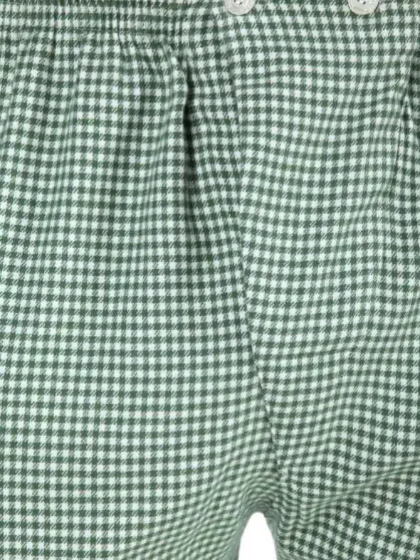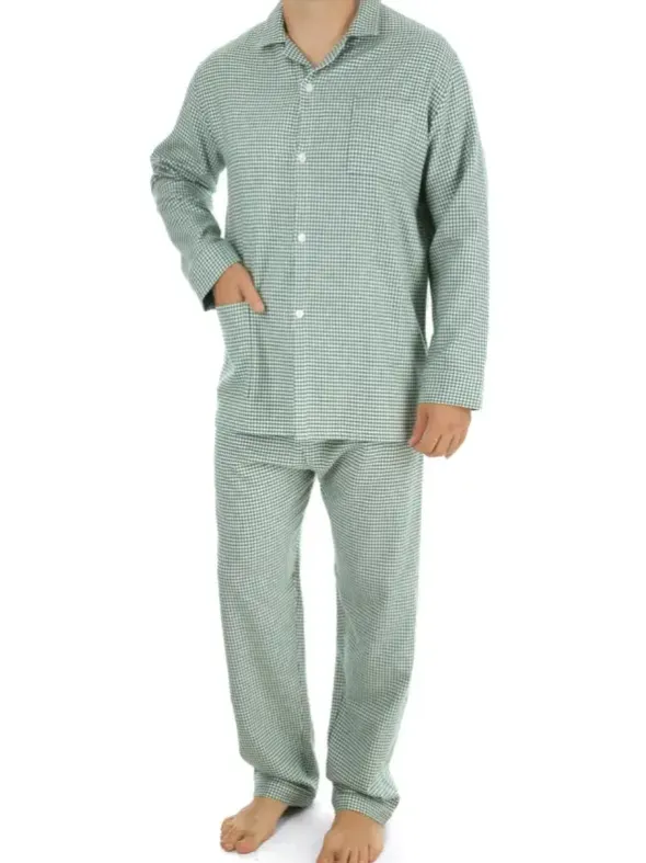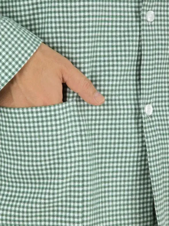 Ein nobler Grünton ziert diesen Flanell-Pyjama Marco in einem edlen Vichy-Karo. Der super flauschige Vollzwirn-Flanell liegt voluminös und wärmend auf der Haut. Die beliebte Herren Schnittform Marco bietet Ihnen neben einer Hose mit NOVILA Softbund und vollständig zu öffnenden Eingriff, eine klassische durchgeknöpfte Jacke im Reversstil. Zwei Brusttauschen vollenden den Klassiker für die kühle Jahreszeit.