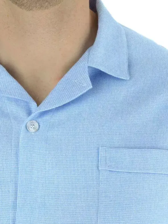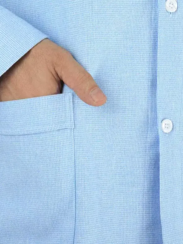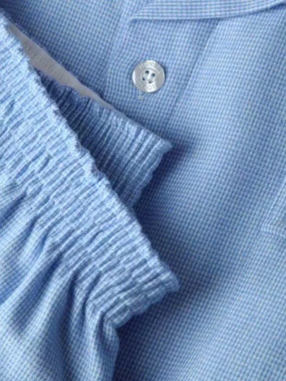Dieser hautschmeichelnde Winterpyjama in der Schnittform Marco besticht durch einen beidseitig gerauhtem Vollzwirn-Flanell. Dieser ist aus hochwertiger Baumwolle gefertigt und beschert Ihnen höchsten Tragekomfort. Die klassische Optik mit spitzem Reverskragen, aufgesetzten Taschen und breiten Arm- und Beinabschlüssen wird wunderbar unterstrichen durch das dezente, hellblaue Minimalmuster. Die gerade geschnittene Hose ist mit einem bequemen und druckfreien Softbund mit geknöpftem Eingriff gefertigt und lässt keine Wünsche offen.