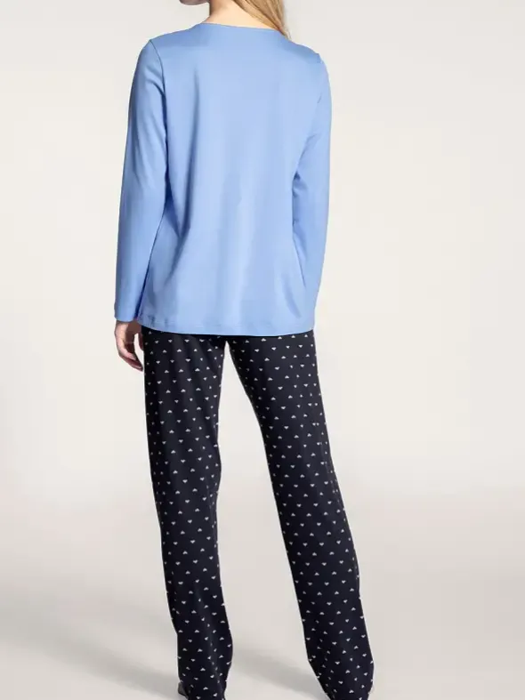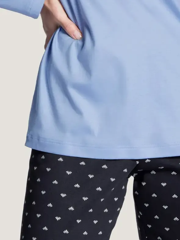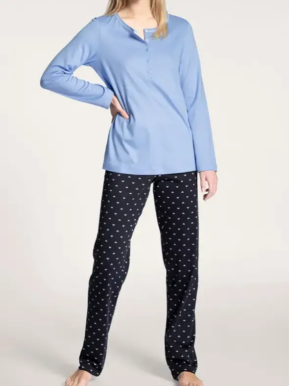 Ein Traum aus reiner Supima Baumwolle, ist dieser Pyjama aus der Night Lovers Serie von CALIDA. Das unifarbene langarm Shirt besticht durch paspelierten Rundhalsausschnitt mit kurzer Knopfleiste in klarem Look. Passend dazu, wird eine lange Hose mit minimalistischem Muster auf dunklem Grund kombiniert. Genießen Sie zarten Interlock Web in bester Verbreitung für erholsame Nächte.