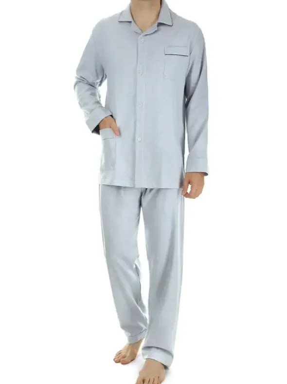Edler Flanellpyjama aus 100% Baumwolle in beidseitig gerauhter Vollzwirn-Qualität. Die Schnittform Patrick überzeugt in klassischem Look mit Reverskragen, aufgesetzten Taschen und gerade geschnittener Hose. Die edle Optik wird durch kontrastfarbene Paspelierungen unterstrichen. Für zusätzlichen Komfort sorgt der bequeme NOVILA Softbuund mit knöpfbarem Eingriff. Breite Arm- und Beinblenden schließen den Look elegant ab. Ein wunderbar wärmender Zweiteiler für die kältere Jahreszeit.