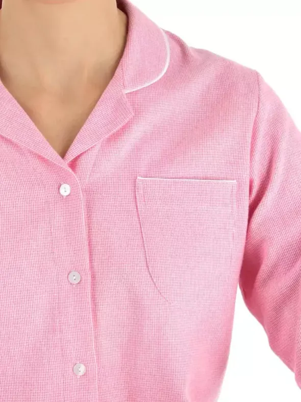 In kuschelig weichem Vollzwirn-Flanell präsentiert NOVILA den beliebten Pyjama Petra, erhältlich in fein kariertem Hellblau oder Flamingo. Der dicht gewebte und flauschig geraute Stoff begleitet Sie zuverlässig durch kältere Nächte. Der patentierte NOVILA Softbund mit Tunnelzug und die Seitennahttaschen der geraden Hose sorgen für praktischen Komfort. Das durchgeknöpfte Oberteil mit aufgesetzter Brusttasche und rundem Reverskragen kreieren einen stilvollen Auftritt. Gehen Sie keine Kompromisse ein, wenn es um Ihr Wohlbefinden geht und entscheiden Sie sich für mit diesem Zweiteiler für eine exquisite Verarbeitung, ausgewählte Rohstoffe und höchsten Tragekomfort.