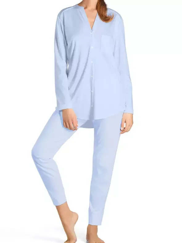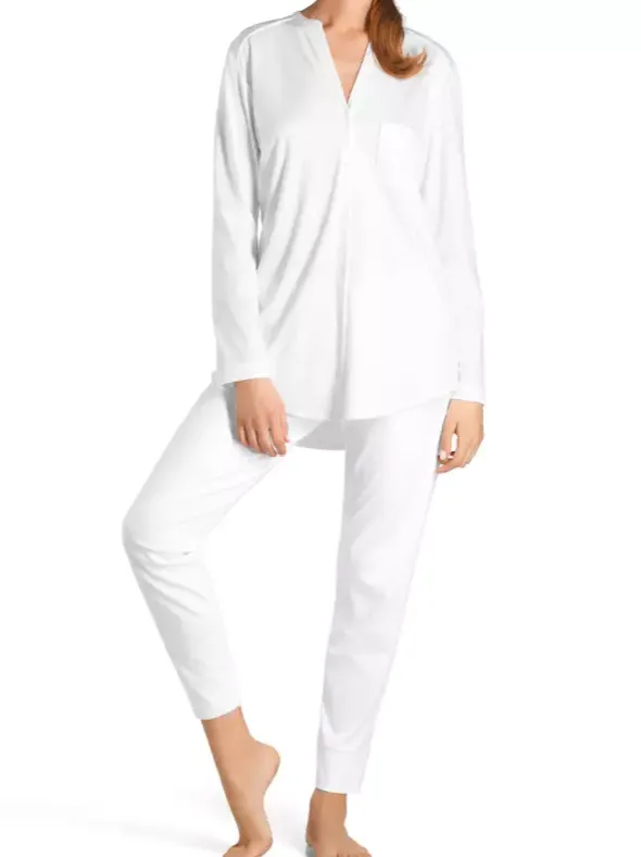 Puristischer Pyjama mit liebevollen Details aus der HANRO Serie Pure Essence. Reiner Baumwoll-Interlock bietet Ihnen einen besonders weichem und blickdichtem Tragekomfort. Legere Schulterpassen und die leicht taillierte Schnittform mit abgerundetem verlängertem Saum verleihem einen modernen Look. Das durchgeknöpfte Oberteil und die schmal zulaufende Hose sitzen perfekt und verwöhnen Sie mit komfortabler Geborgenheit.