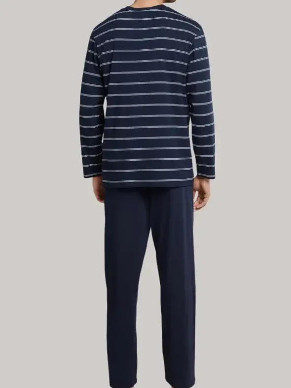 Reine Baumwolle in einer weichen Single Jersey Qualität vereint einen natürlichen Tragekomfort mit unkomplizierten Pflegeeigenschaften und ist so die perfekte Wahl für diesen sportiven Pyjama aus der Schiesser Kollektion Day and Night. Das Langarm Shirt mit V – Ausschnitt und flachen Abschlüssen an den Armen in Ringelchick aus weiß und grau auf dunkelblauen Grund sorgt für ein lockeres Erscheinungsbild. Eine leger sitzende lange Hose mit Bindeband und weiten Beinabschlüssen macht diesen Zweiterler perfekt.