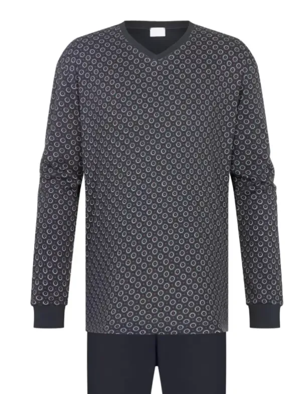 Der lange Herrenanzug aus der Serie „Octagon Geo“ besticht durch sein feines grafisches Muster und die harmonische, noble Farbgebung. Hergestellt aus 100 % Baumwolle, sorgt das brushed Interlock-Material für ein wärmendes und flauschiges Tragegefühl. Arm- und Beinbündchen sowie ein V-Ausschnitt im Oberteil, passend zur unifarbenen Hose, runden das elegante Design ab.