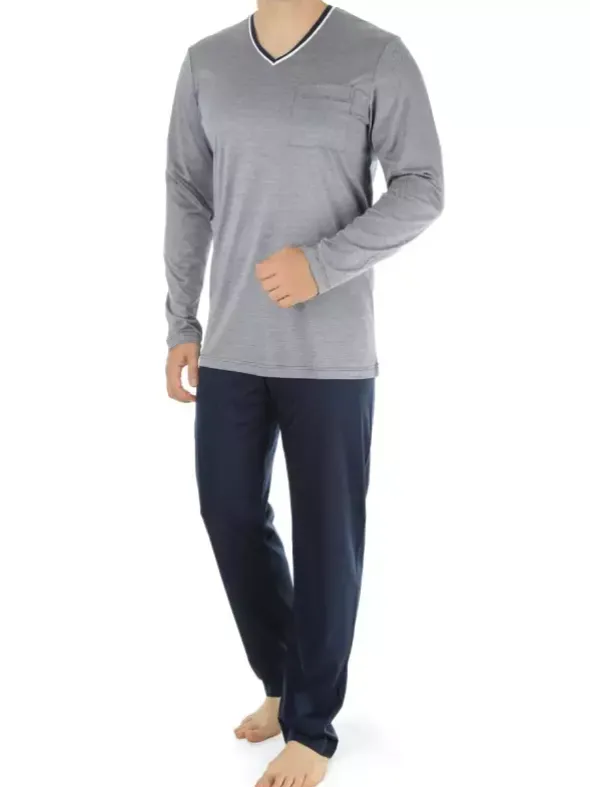 Der edle Pyjama Sir, hier in gedecktem Marineblau mit schicker Paspelierung am V-Ausschnitt wird durch den weichen und hautschmeichelnden Single-Jersey in Feinzwirn-Qualität zum absolutem Lieblingsoutfit. Die gerade geschnittene Hose mit bequemen Gummibund ergänzt sich unifarben wunderbar zu dem in feinem Jaquard-Muster gehaltenen Oberteil mit aufgesetzter Brusttasche. Ein wunderbar unkomplizierter und pflegeleichter Nachtwäschelook für jeden Tag.