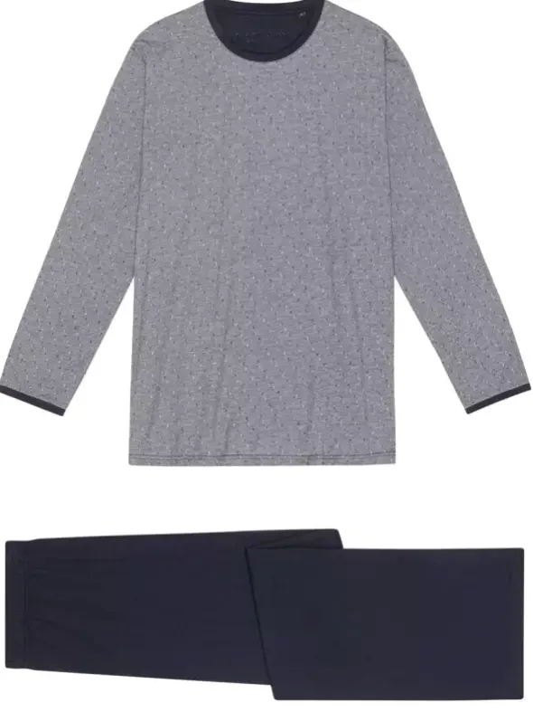 Ein komfortabler und zugleich umweltbewusst gefertigter Nachtwäschelook erwartet Sie mit diesem Herrenpyjama aus weichem Single-Jersey. Das stilvoll gemusterte Oberteil ist mit bequemen Rippdetails am Hals-und Armausschnitt gefertigt. Die unifarbene Hose überzeugt mit einem angenehmen Gummibund. Ein perfekter Begleiter für erholsame Stunden.