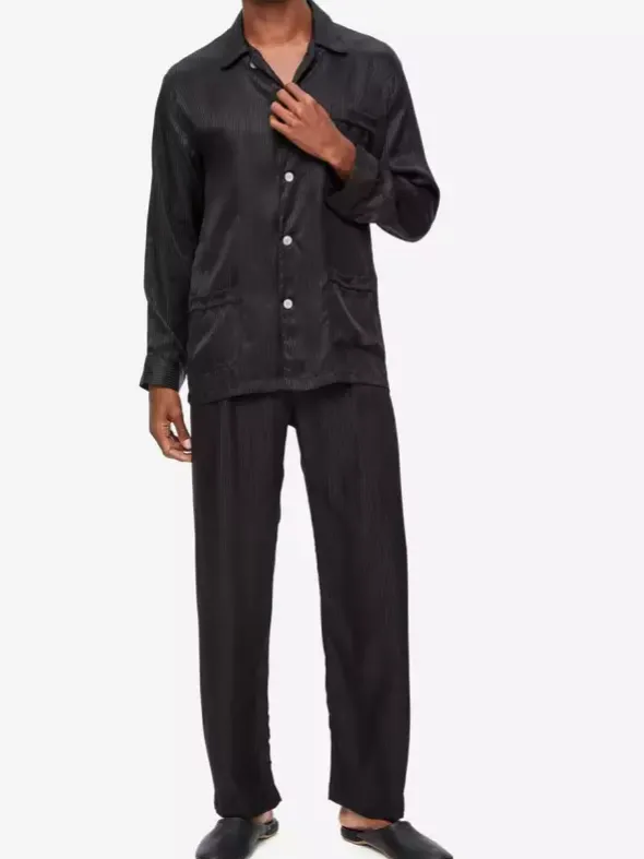 Luxuriöser Tragekomfort erwartet Sie bei diesem Herrenpyjama aus reiner, hochwertiger Seide. Genießen Sie das unvergleichlich leichte und weiche Tragegefühl dieses edlen Pyjamas. Dank der temperaturregulierenden Eigenschaften wird dieser zu einem perfekten Begleiter das gesamte Jahr über. Der Schnitt ist klassisch mit geknöpftem Oberteil, Reverskragen und 3 aufgesetzten Taschen. Die Hose überzeugt mit einem knöpfbaren, verstellbaren Bund und elastischen Seitenteilen.