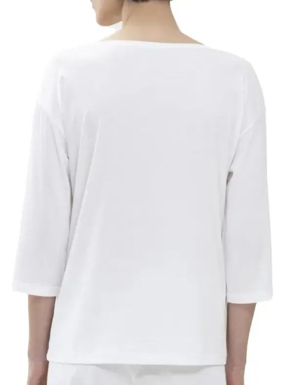Ein legeres Shirt mit 3/4-Armlänge von mey. Es ist aus hochwertiger Biobaumwolle gefertigt und sowohl mit dem Grünen Knopf, als auch GOTS-zertifiziert. Das edle und feine Maschenbild kommt in der Farbe reinweiß elegant zur Geltung. Die lockere Passform wird mit einem breiten Rundhalsauschnitt und einer Satin-Tasche aus recyceltem Polyester ergänzt. Ideal zum Schlafen oder Relaxen.