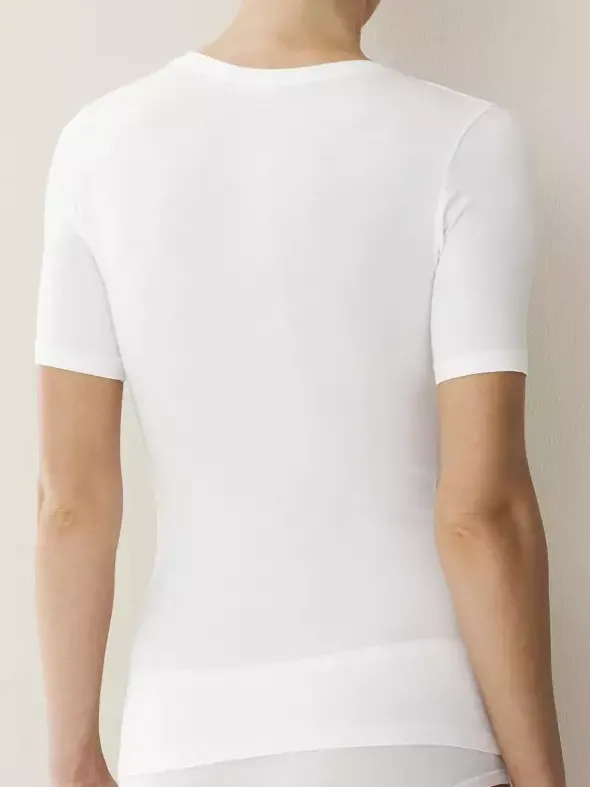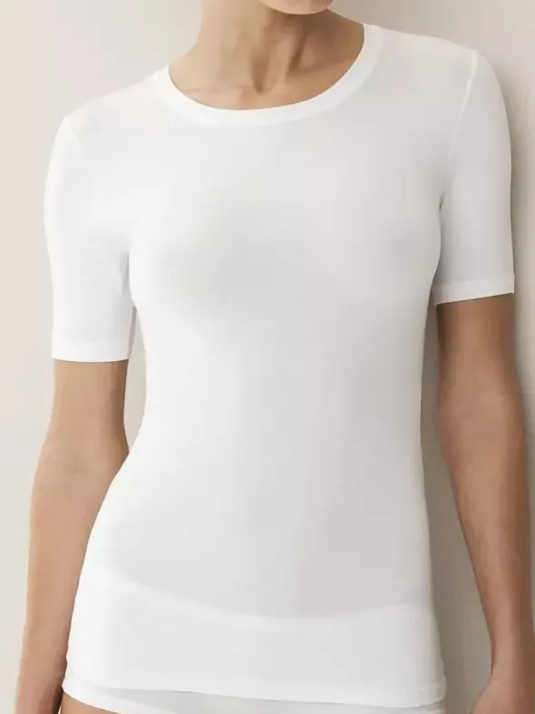 Zimmerli Damen T-Shirt aus der Serie 700 Pureness – ein Luxus Kurzarm Rundhals Shirt der Extraklasse, wahlweise in weiß, dunkelblau oder schwarz, gefertigt in Single Jersey aus feinster Micro-Modal Qualität – eine ultraleichte Stoffqualität mit hoher Durchlässigkeit und verunreinigungsresistenter Oberfläche. Ultraflache Nähte und sehr angenehmer Bund. Pureness sitzt wie angegossen und fühlt sich an wie eine zweite Haut. Schweizer Handarbeit – akkurat verarbeitet. Verwöhnen Sie sich mit diesem Damenshirt, das höchsten Ansprüchen gerecht wird.