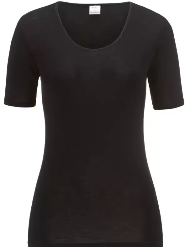 ISA Bodywear Schweizer Damen Unterwäsche – aus der Serie Wool & Silk by ISA ein klassisches und bequemes Shirt Kurzarm mit Rundhalsauschnitt wahlweise in creme oder schwarz – aus einer feinen und hochwertigen Schurwolle – Seide Qualität, gefertigt im klassischem Schnitt. Das hochwertige Damenunterhemd läßt keine Wünsche offen.