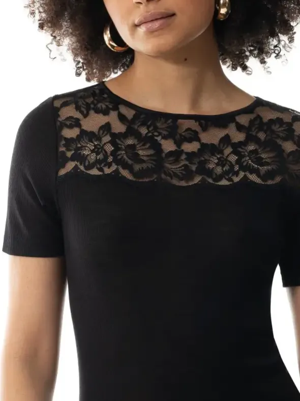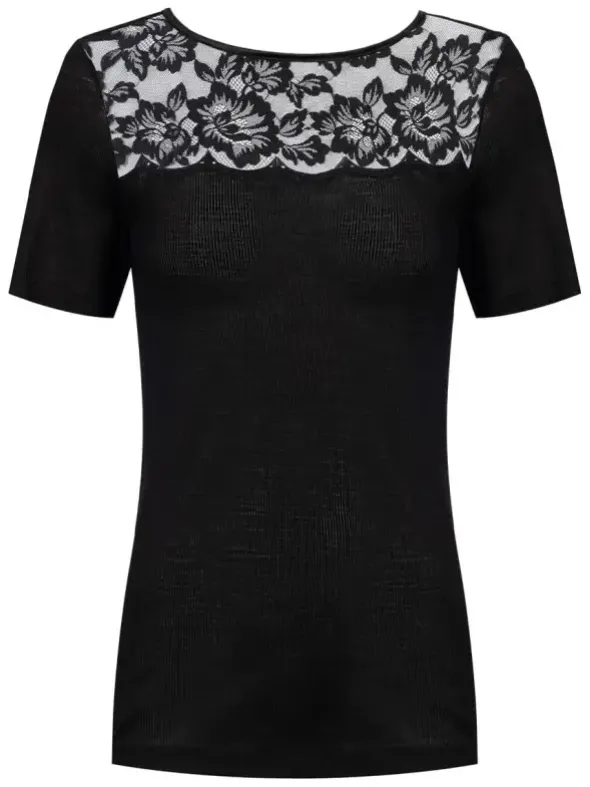 Das T-Shirt aus der Serie Wool Love vereint Wolle und Seide mit einer zarten Spitzenverzierung am Dekolleté. Es bietet eine schmale Passform, einen klassischen Rundhalsausschnitt und kurze Ärmel. Hergestellt aus Merino-Schurwolle gewährleistet es ein natürliches Tragegefühl. Unser Model trägt Größe 38/40. Bitte beachten Sie für die Pflegehinweise eine Maschinenwäsche bei 30°C im Feinwaschgang und vermeiden Sie den Trockner.