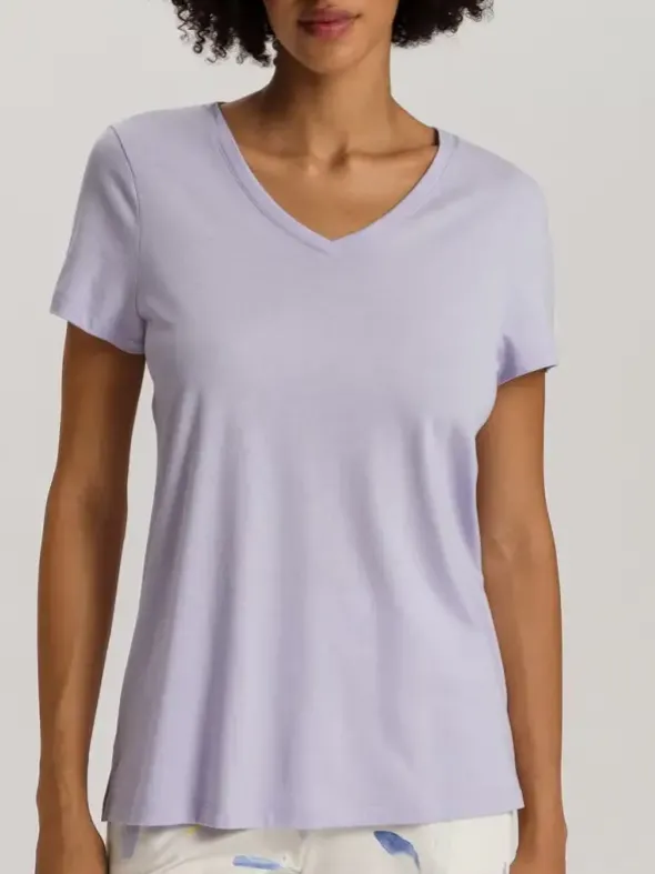 Das Sleep & Lounge Shirt Kurzarm von HANRO ist die perfekte Wahl für entspannte Tage und Nächte. Aus einer weichen Mischung aus Baumwolle und TENCEL™ Modal gefertigt, bietet dieses Shirt ein besonders angenehmes Tragegefühl. Der fließende Stoff, produziert in Österreich, fühlt sich leicht und atmungsaktiv auf der Haut an. Der klassische V-Ausschnitt und der lockere Schnitt machen das Shirt zu einem vielseitigen Kleidungsstück, das sich sowohl zum Schlafen und Loungen als auch zu casual Looks mit Jeans kombinieren lässt. Es ist ein absolutes Must-have für Frauen, die Komfort und Stil in einem praktischen Design suchen.