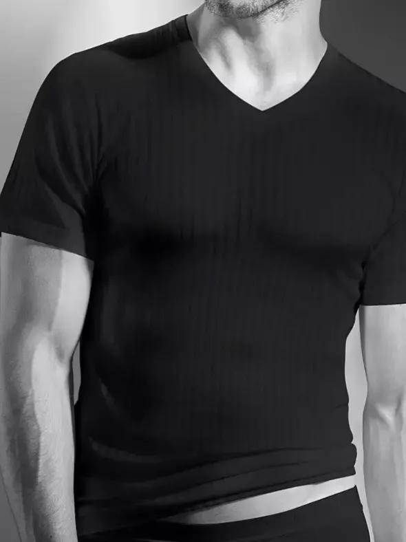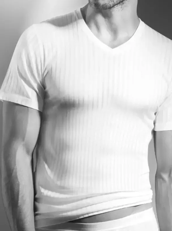 ISA Bodywear Swissline Striped – hochwertige Herrenunterwäsche aus der Schweiz – ein hochwertiges V – Shirt Unterhemd mit Kurzarm, gefertigt aus Baumwolle in Swiss Cotton Premium Qualität. Wahlweise in weiß oder schwarz erhältlich. Bequeme Passform, sportive Streifenstruktur und angenehmes Tragegefühl zeichnen dieses Wäschestück aus.