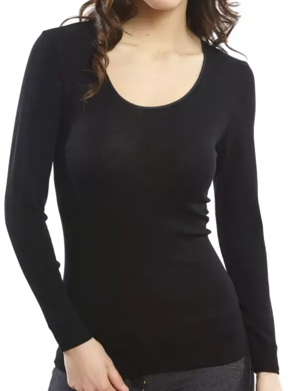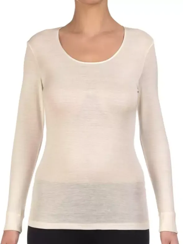 Ein Shirt mit langem Arm, wahlweise in creme oder schwarz in perfekter Passform, aus der Serie Merino Wool der Luxusmarke Oscalito – Unterwäsche für Damen. Feine, zarte Optik, und schlichte Eleganz vereinen sich zu purem Luxus auf der Haut. Feinste Merinowolle, verarbeitet zu einem glatten Gewebe verleiht dem Kleidungsstück einen weichen Griff. Ein Shirt mit rundem Ausschnitt mit Satineinfass welches höchsten Ansprüchen an Bequemlichkeit gerecht wird.