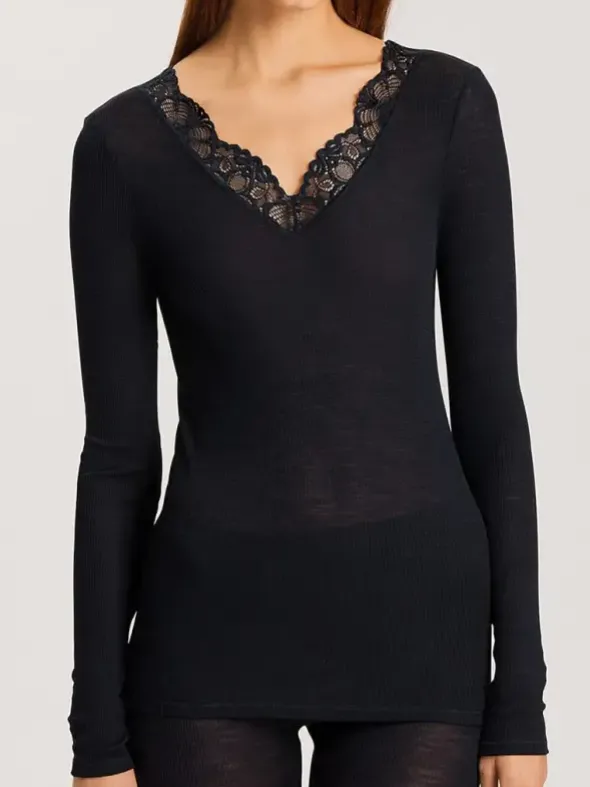 Das Damen Langarmshirt aus der HANRO Serie Woolen Lace bietet luxuriösen Komfort dank der Mischung aus mulesing-freier Merinowolle und purer Seide. Der wärmende 2:2 Feinripp ist natürlich weich und temperaturregulierend, was das Shirt ideal für kühle Tage macht. Der V-Ausschnitt ist mit zarter Jacquardtronic-Spitze verziert, was dem Oberteil eine feminine Note verleiht. Perfekt kombiniert mit passender Panty oder Leggings, eignet sich dieses Shirt sowohl für zuhause als auch als Skiunterwäsche.