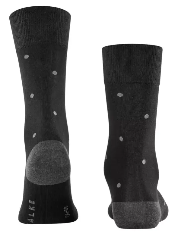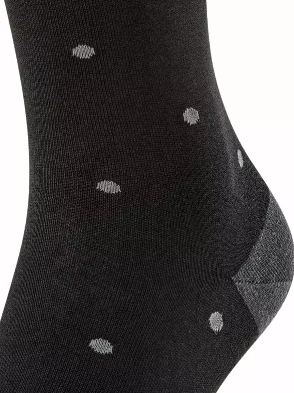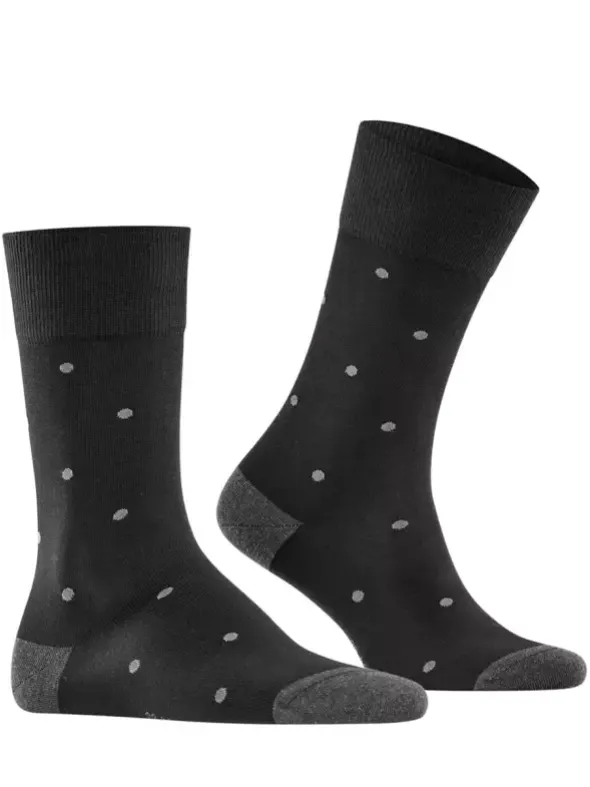 Business-Strumpf aus feiner merzerisierter Baumwolle auf der Außenseite und weicher gekämmter Baumwolle auf der Innenseite mit einer zeitlosen Punkte-Musterung. Eine feine, flache Spitzennaht sorgt für ein angenehmes, druckfreies Tragegefühl. Optimale Haltbarkeit durch verstärkte Belastungszonen.