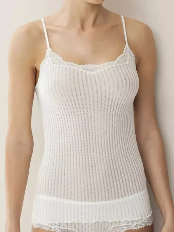 Zimmerli Damen Top aus der Serie 260 Maude Privé – ein Luxus Spaghetti Top der Extraklasse, wahlweise in schwarz, ecru oder blush (pfirsich), gefertigt in einem aufwendigen Strickverfahren ohne Seitennaht und einer feinen Ajouré-Rippe aus feinster, langstapeliger, gezwirnter Baumwolle. Verzierungen im Ausschnitt aus elastischer und raffinierter Webspitze aus Calais. Schweizer Handarbeit – akkurat verarbeitet. Verwöhnen Sie sich mit diesem Damentop, das höchsten Ansprüchen gerecht wird.