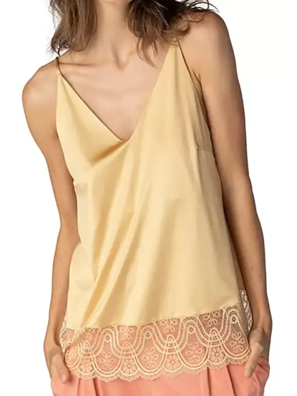 Mey Damenwäsche Serie Colette – die neue, edle Wäsche Serie – hier ein bequemes und hochwertiges Spaghetti Top in trendiger Ausführung und weiter Passform in der Trendfarbe pistachio. Das Top ist mit schmalen Trägern und tiefem V – Ausschnitt sowie aus einem hochwertigen Materialmix mit geringem Elasthananteil gefertigt. Diese wunderbare Kombination aus Baumwolle und Viskose sorgt für perfektes Hautklima und behaglichen Tragekomfort. Eine üppige, detailreiche Spitze am unteren Saumwabschluss sorgt für einen feminen Auftritt und optische Raffinesse. Egal ob zum schlafen oder für einen lässig, weiblichen Freizeit – Look – dieses Top ist immer ein Hingucker.