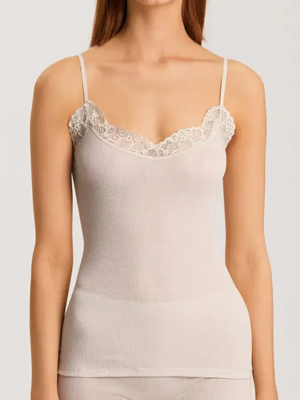 Das wärmende Damen Top mit Spaghettiträgern aus der HANRO Serie Woolen Lace ist aus einer luxuriösen Mischung aus mulesing-freier Merinowolle und edler Seide gefertigt. Der weiche 2:2 Rippstoff aus österreichischer Produktion bietet natürliche Temperatur- und Feuchtigkeitsregulierung. Die zarte 3-D-Jacquardtronic-Spitze am Dekolleté verleiht dem Top eine feminine Note. Ideal als Unterhemd, auch unter Blazern und Blusen, sorgt dieses Top für Luxus auf der Haut, selbst bei kühlen Temperaturen.