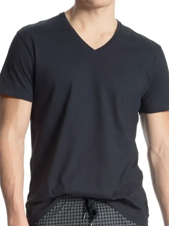 CALIDA Herren Basic – Kollektion Remix Basic – Homewear und Loungewear – hier ein V – Shirt mit kurzem Arm in trendigem Look. Das Shirt ist aus reiner Baumwolle in Single Jersey Qualität gefertigt. Ideal kombinierbar mit den anderen Artikeln der Remix Basic Serie.