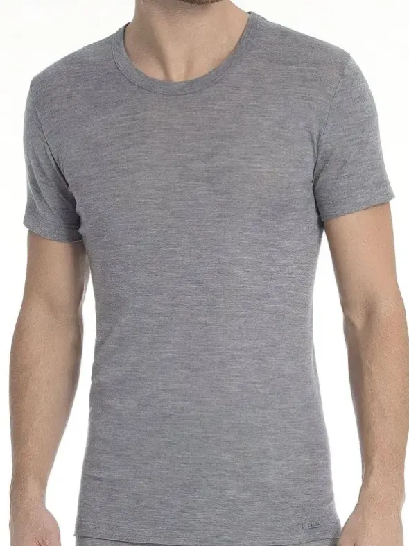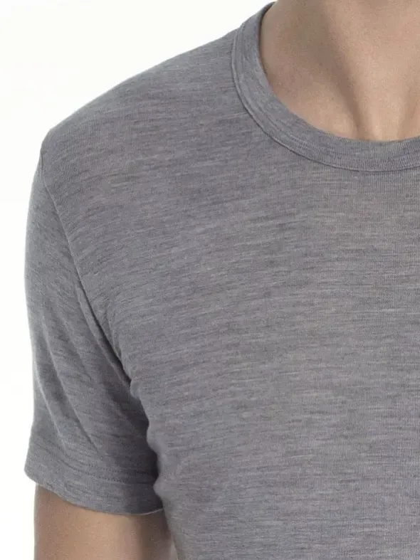 CALIDA Wool & Silk – die Herren Tagwäsche Warmwear Serie – hier ein T-Shirt mit kurzem Arm im Frackschnitt, wahlweise in den Farben grau oder anthrazit. Das Shirt ist aus einer feinen Merinowolle Seide Mischung in Feinripp Quälität gefertigt.