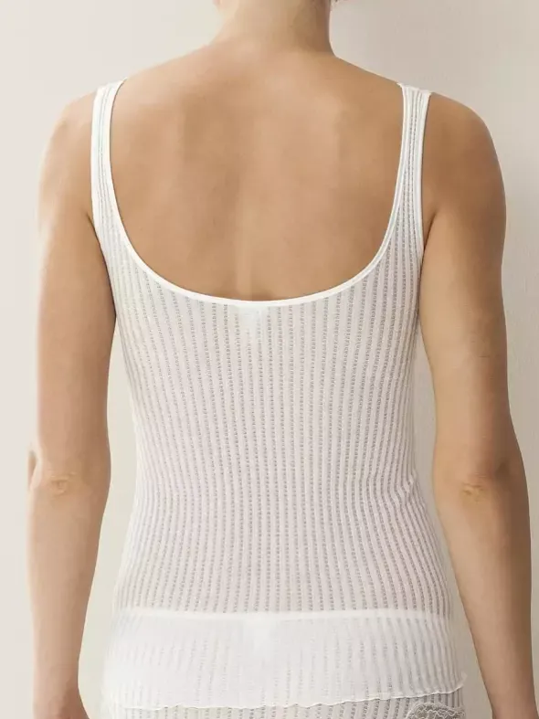 Zimmerli Damen Top aus der Serie 260 Maude Privé – ein Luxus Tank Top mit breiten Trägern der Extraklasse, wahlweise in schwarz, ecru oder blush (pfirsich), gefertigt in einem aufwendigen Strickverfahren ohne Seitennaht und einer feinen Ajouré-Rippe aus feinster, langstapeliger, gezwirnter Baumwolle. Verzierungen im Ausschnitt aus elastischer und raffinierter Webspitze aus Calais. Schweizer Handarbeit – akkurat verarbeitet. Verwöhnen Sie sich mit diesem Top, das höchsten Ansprüchen gerecht wird.
