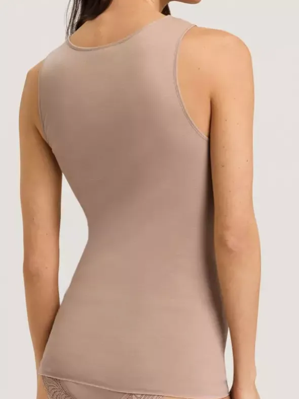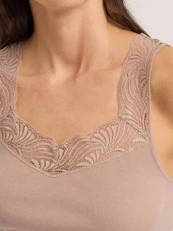 Komfortabel und zugleich in femininer Optik besticht das Spaghetti Top Milea aus der aktuellen HANRO Kollektion. Das weiche Feinrippmaterial aus 100% merzerisierter Baumwolle liegt angenehm schmeichelhaft auf Ihrer Haut. Der Ausschnitt ist in einer dezenten V-Form gefertigt und mit zarter Spitze verziert. Breite Träger und der Verzicht auf Saum- und Seitennähte versprechen eine ideale Passform.