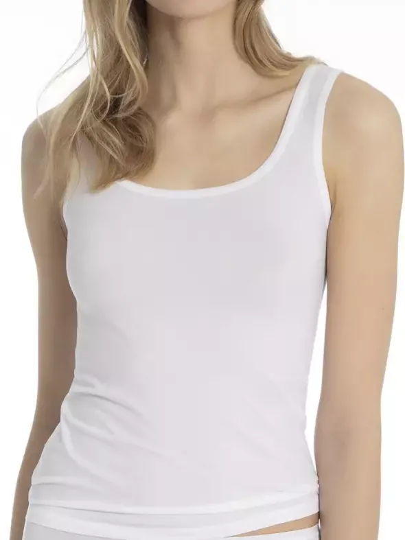 Aus der CALIDA Damen Tagwäsche Serie Balance , ein Tank Top im Frackschnitt und mit rundem Ausschnitt in sportlich femininer Optik und erstklassiger Verarbeitung, wahlweise in weiß oder schwarz erhältlich. Ein angenehmes Single Jersey Gewebe aus feiner Lyocellfaser und Baumwolle sorgt für ein tolles Tragegefühl an jedem Tag.