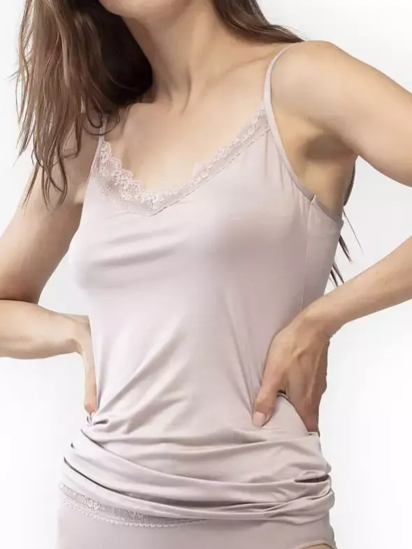 Ein schönes Everyday-Shirt aus der Serie Luise von mey mit hochwertiger Spitzenbordüre am V-Ausschnitt. Die schmale Passform und die verstellbaren Spaghettiträger ergänzen sich mit dem geschmeidige Fall des Modalgemischs zu einem wunderbar femininen Look – egal ob als Tagwäsche kombiniert mit dem passenden Unterteil oder leger zur Jeans als Alltagslook.
