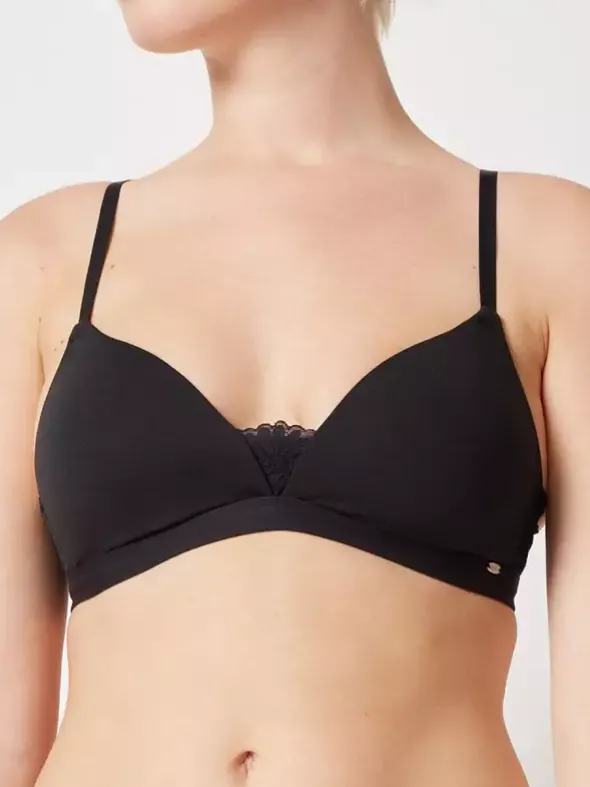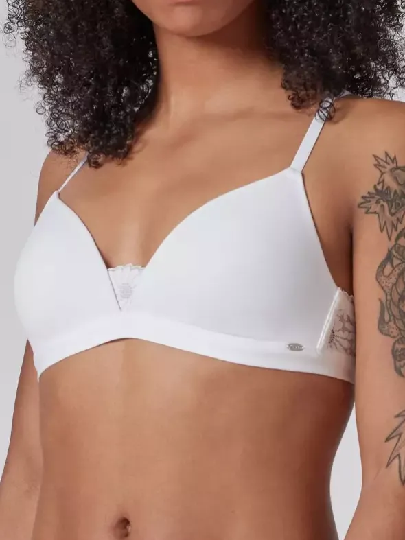 Maximal bequemer Triangel-BH aus softer Baumwolle ohne Bügel. Die gepolsterten Cups sorgen zusammen mit dem breiten Unterbrustband und dem Hakenverschluss am Rücken für optimalen Halt, ein dezenter Spitzeneinsatz verleiht das gewisse Extra.